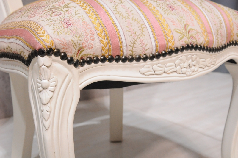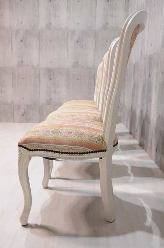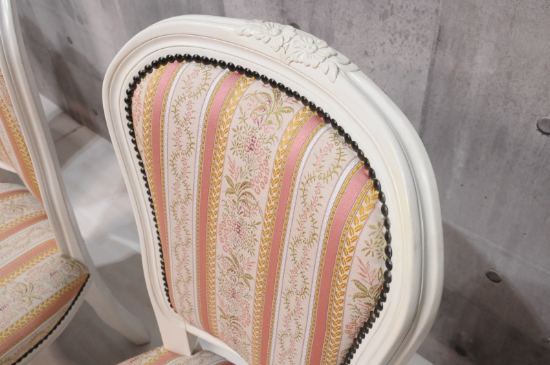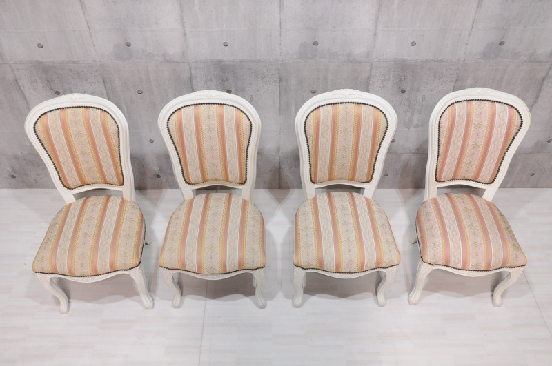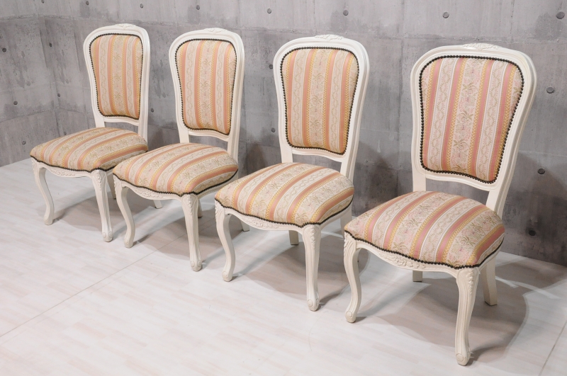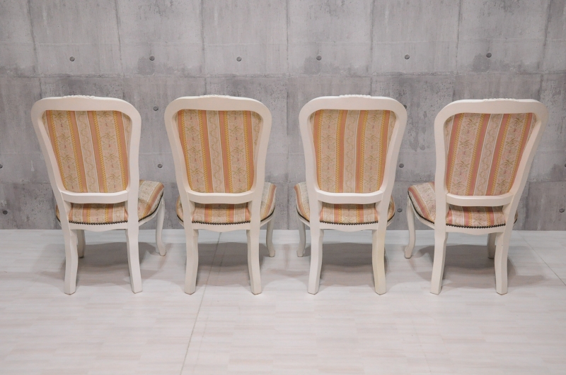 美品 エレガント ロココ調 猫脚 ダイニングチェア 4脚セット 彫刻 鋲打ち 食卓椅子です。◇サイズ幅50cm × 奥行き61cm × 高さ98cm 座面の高さ47cm※素人採寸の為、多少の誤差はお許しください。◇状態全体的に使用感、スレや小傷はあるものの美品レベルかと思います。画像にてご確認ください。1 脚、脚に青いインクのような汚れがあります。