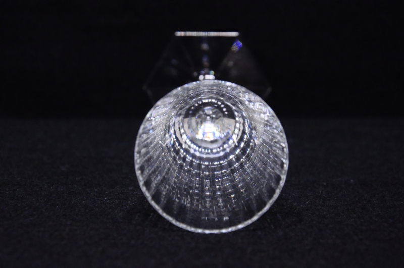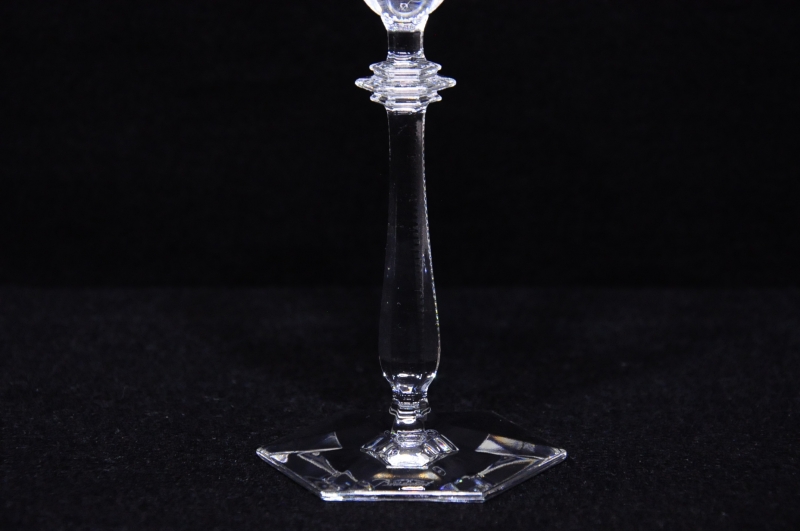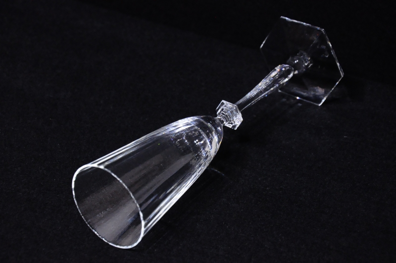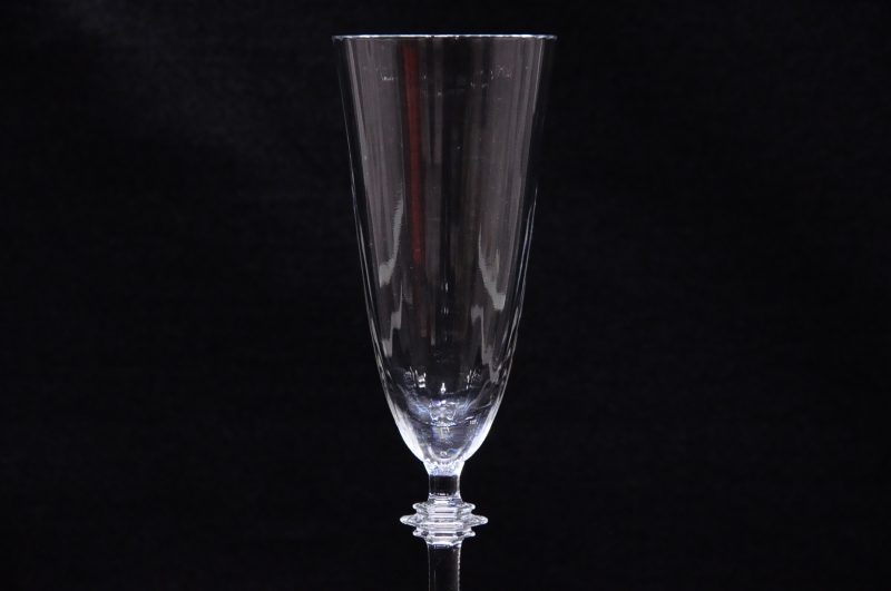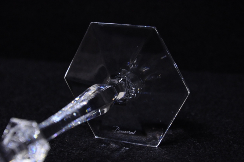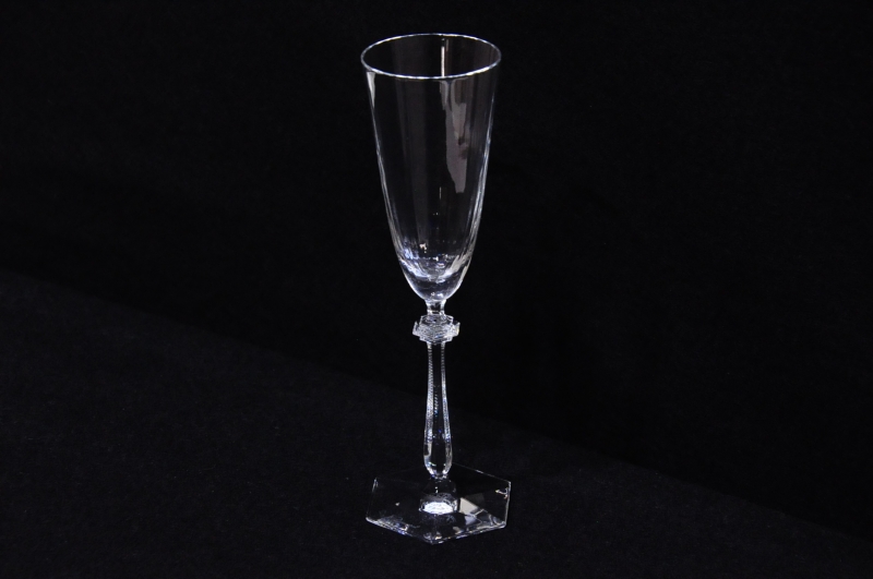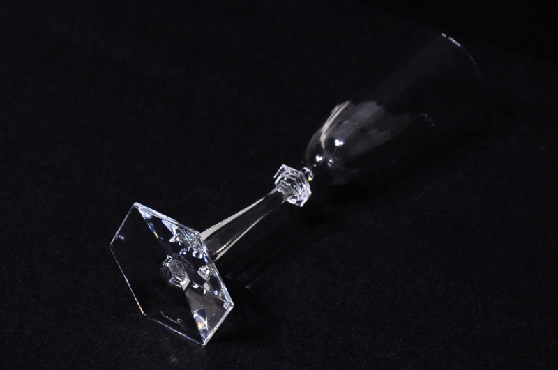 バカラのアルカード、シャンパンフルート。スタイリッシュな外観と、六角形をベースにしたデザインで、底部も六角形です。ステム(脚)も六角形をベースにしたデザインで、ステム上部にある突起部分も六角形です。背が高めのデザインのグラス。