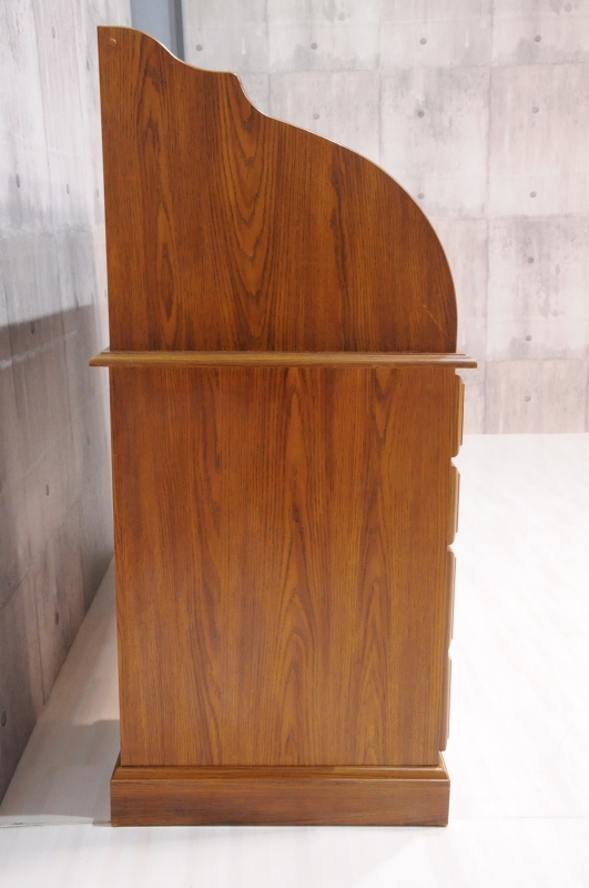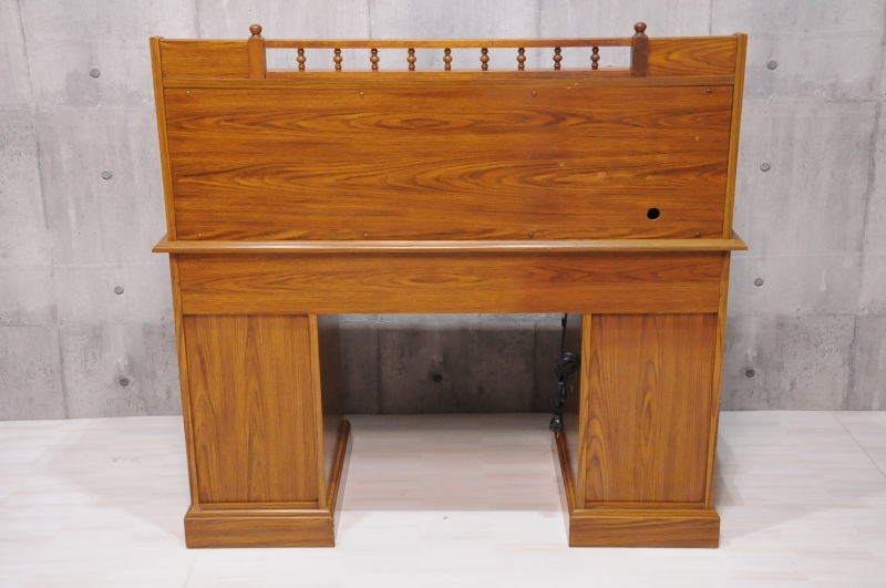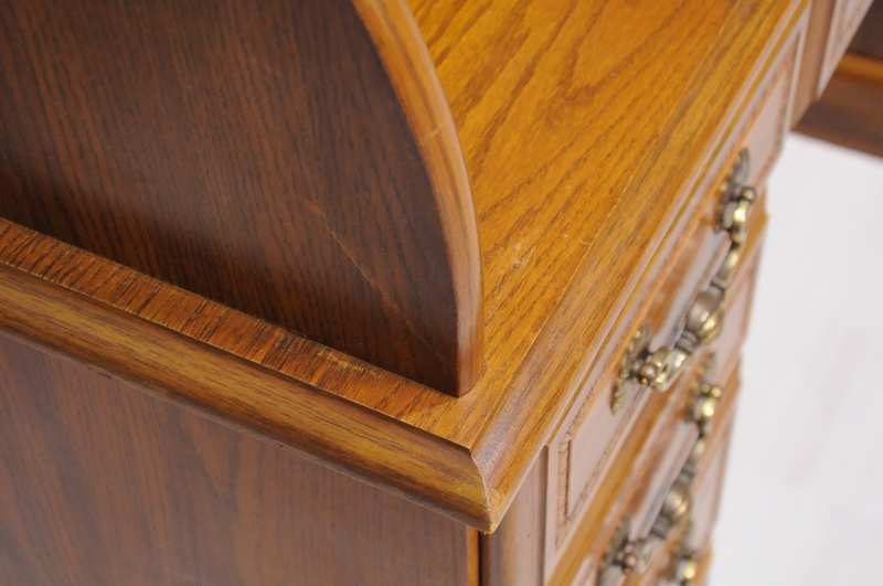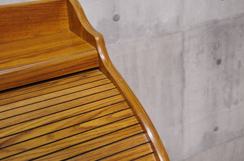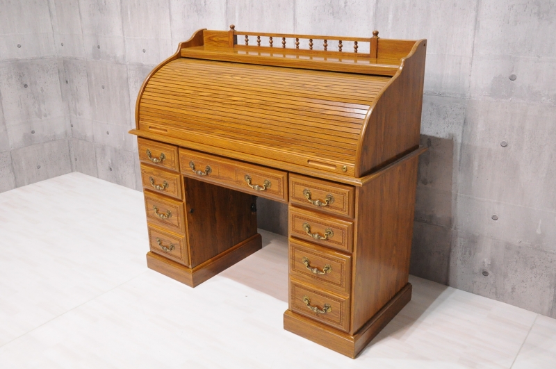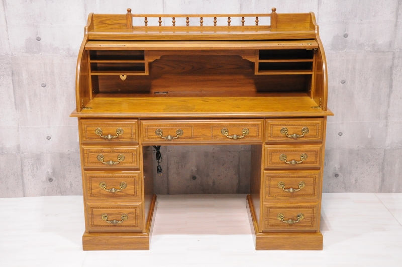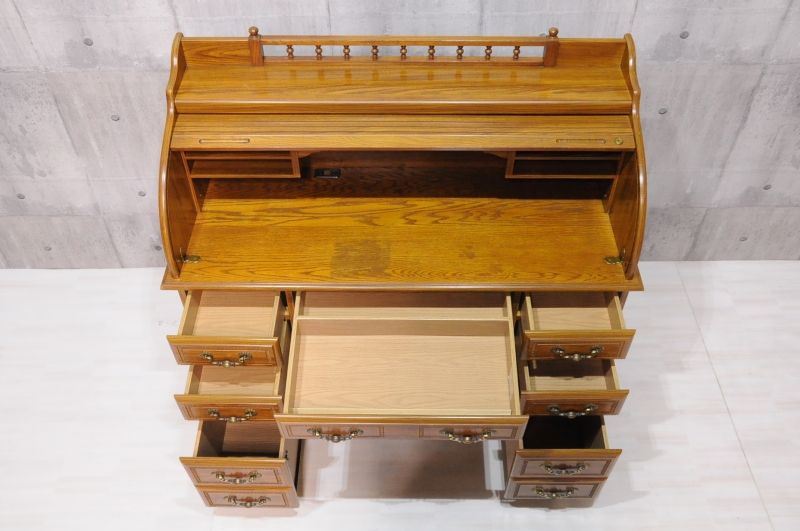 美品 アメリカ製 RIVERSIDE FURNITURE社 ロールトップデスク ライティングデスク 両袖机です。◇サイズ幅131cm × 奥行き56cm × 高さ123cm 天板高76.5cm※素人採寸の為、多少の誤差はお許しください。◇状態全体的に多少の使用感、傷があります。画像にてご確認ください。鍵はありません。ロールトップの開閉はスムーズです。