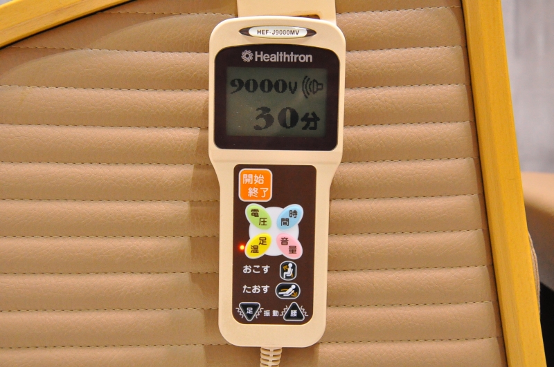 スタートから終了はもちろん、すべての操作が、手元のリモコン一つで行えます。表示画面には、明るく見やすい大型液晶を採用。さらに、使い方を分かりやす くご案内する「音声ガイド」を採用しました。またヘルストロンの電界内でのご使用に配慮し、独自開発のセラミックスピーカーをリモコンに内蔵しています。