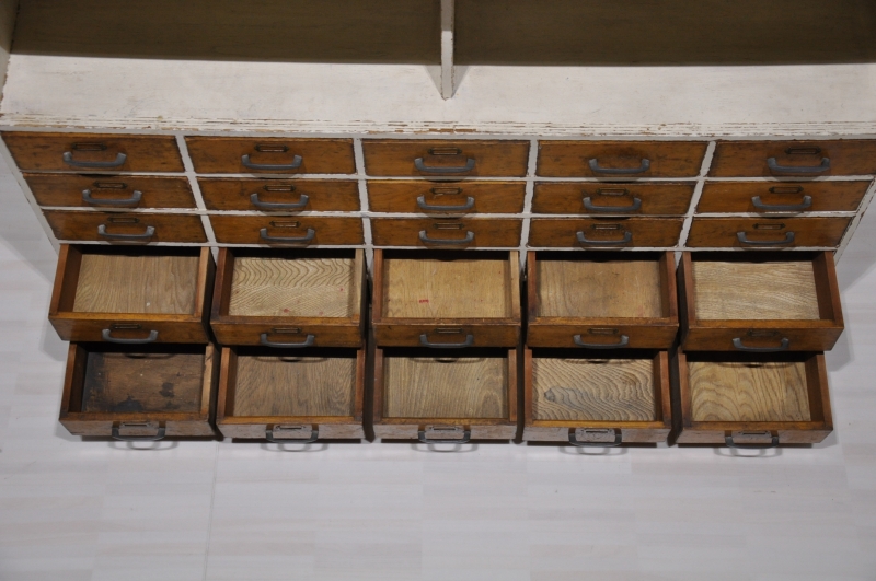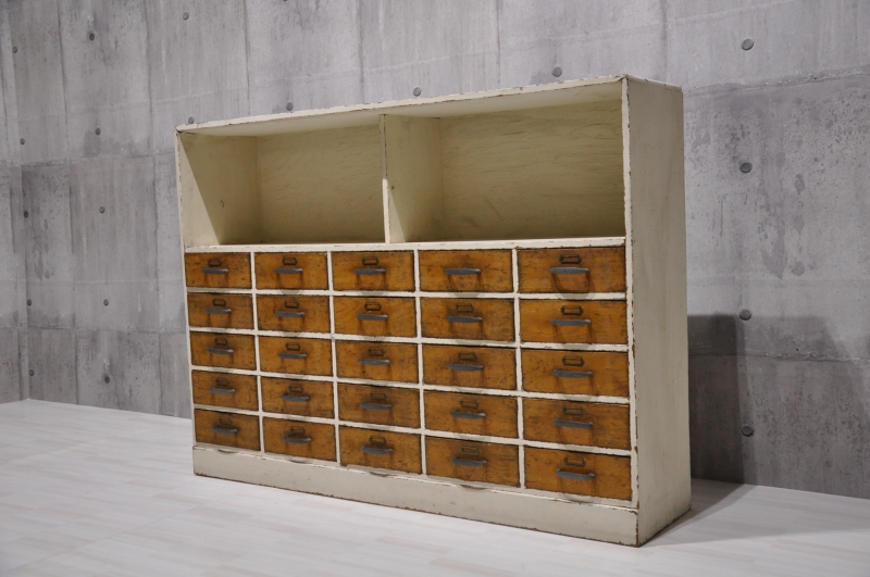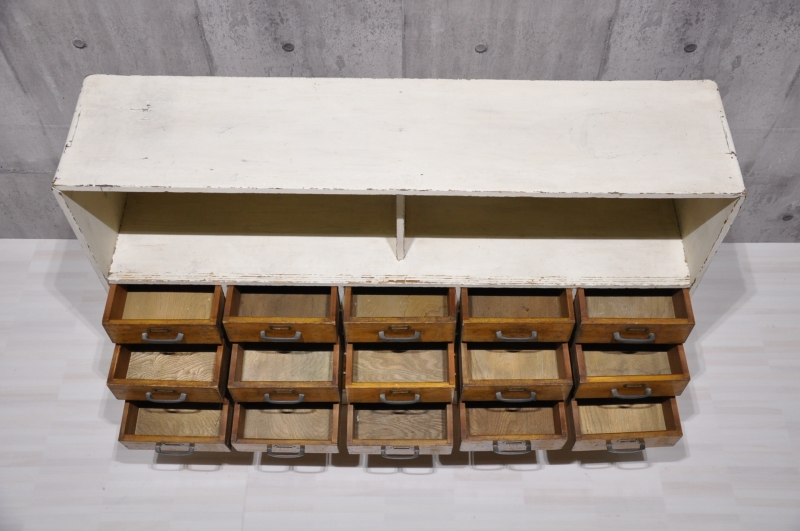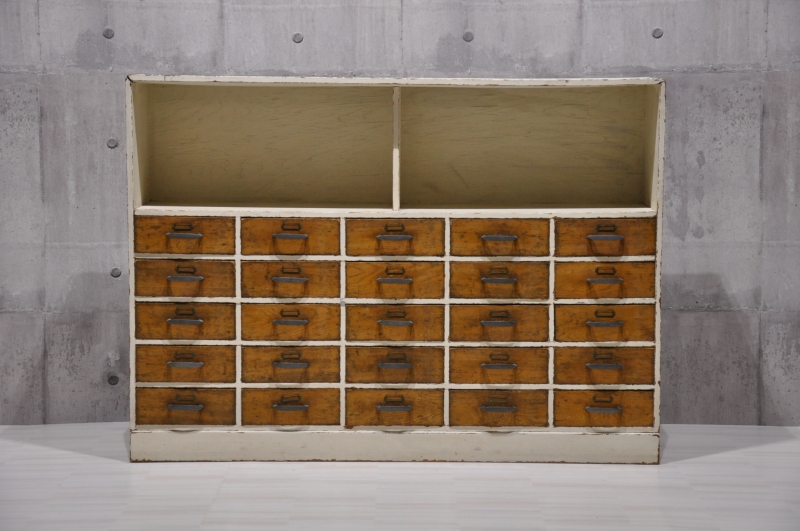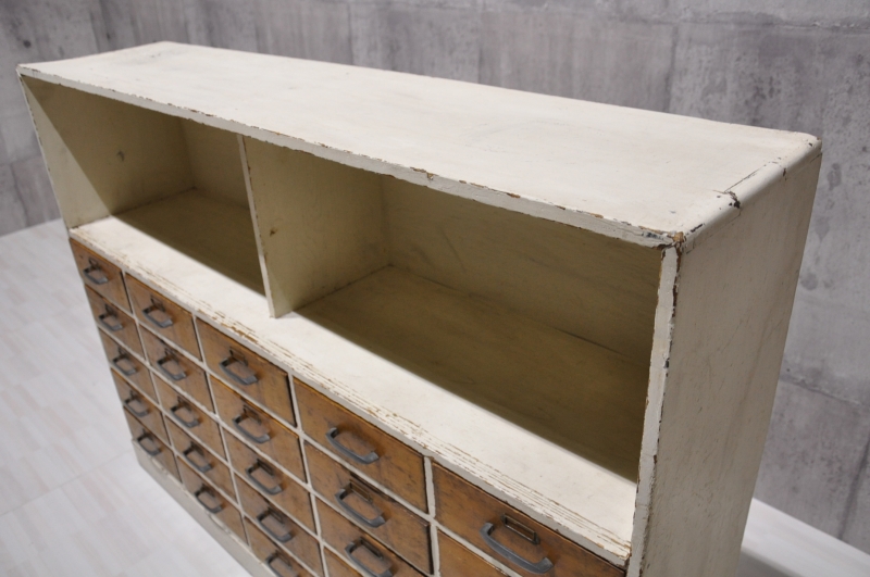 シャビーシックな5段 25杯 小引き出し サイドボードです。前の所有者からはアンティークショップで12万程で購入したフランスアンティークの輸入家具、とお聞きしていますが、どこにも記載が無く当方では判断できかねますので画像優先でお願いします。◇サイズ幅126cm × 奥行き29cm × 高さ91.5cm※素人採寸の為、多少の誤差はお許しください。◇状態全体的に使用感、傷が多数あります。天板、向かって左角が反っています。画像にてご確認ください。
