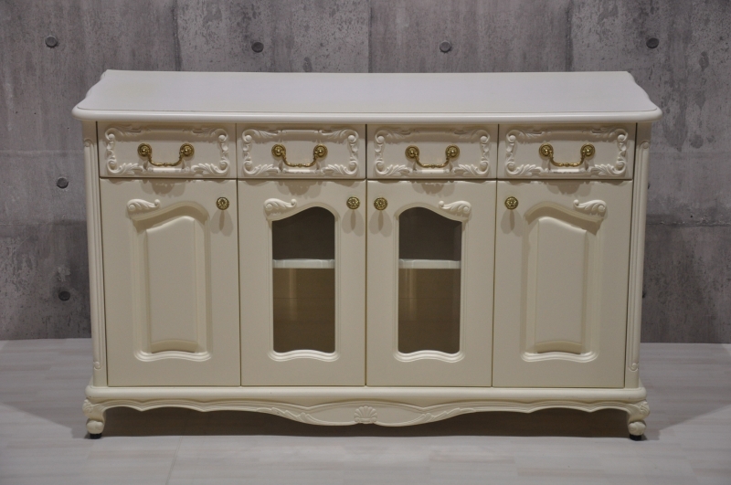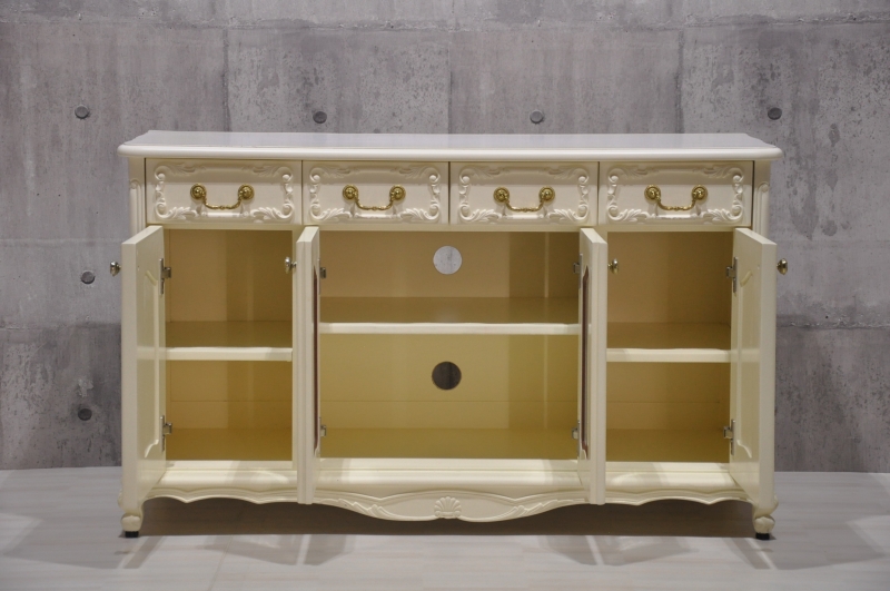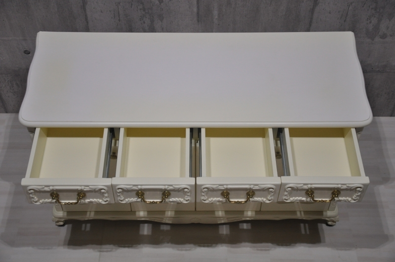 ウエストハウスギャラリー ロココ調 サイドボード キャビネット テレビボードです。展示品回収業者からの仕入れ品で展示品だった物ですが、状態がそこまで良くない為タイトルには入れていません。◇サイズ幅120cm × 奥行き45cm × 高さ72cm※素人採寸の為、多少の誤差はお許しください。◇状態天板にヤケ、傷、向かって左奥角に割れがあります。引き出しや棚内にもスレや傷があります。画像にてご確認ください。