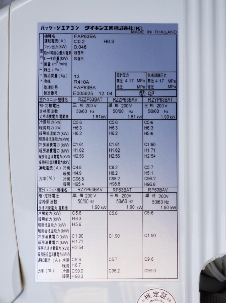 DAIKIN ダイキン パッケージエアコン 業務用 2.5馬力 壁掛け エアコン FAP63BA 2012年製 単相 200V リモコン2個付き 外機 RZYP63BBVの出品です。